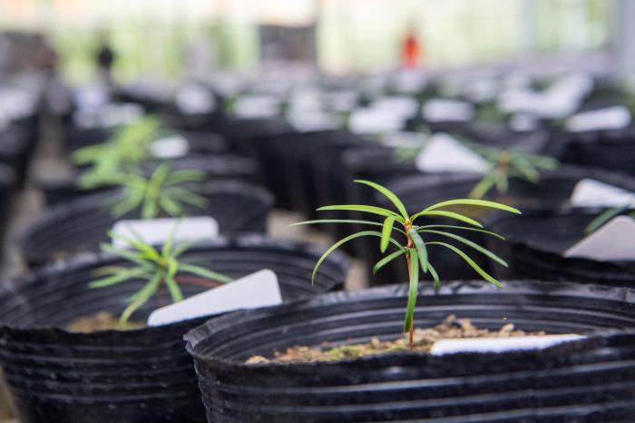 近年来重庆金佛山国家级自然保护区管理事务中心针对以国家一级重点保护野生植物银杉和国家一级重点保护野生动物黑叶猴为代表的珍稀物种引进科技手段建立立体化生态监测网络和体系,开展生物多样性保护研究。这是9月22日拍摄的人工繁育的银杉幼苗。