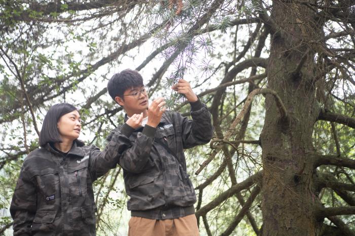 借助科学方法和技术设备的有力支撑,黑叶猴种群数量从2015年的21群150余只增加到目前的23群180余只,活动范围也逐渐扩大;银杉人工繁育幼苗成活率从不足10%提高到80%以上。9月22日,在银杉群落监测样地,工作人员李新(右)、王泳鳗在查看001号银杉的健康状况。