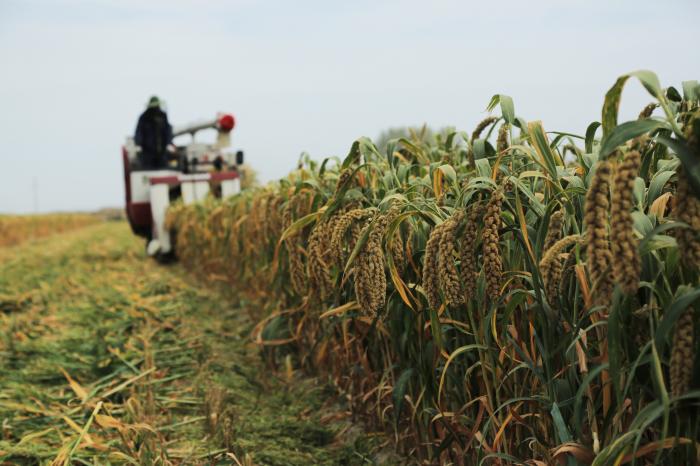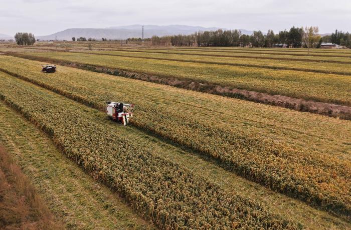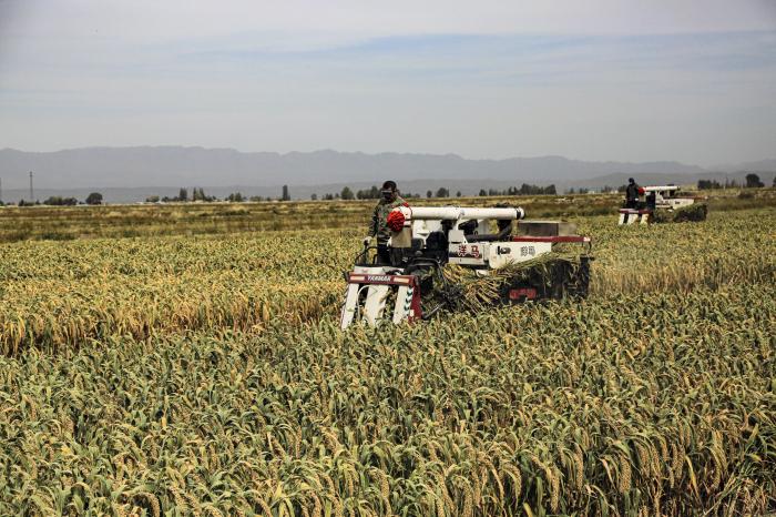 9月24日,收割机在甘肃省张掖市山丹县位奇镇暖泉村收割谷子。新华社发(陈礼摄)