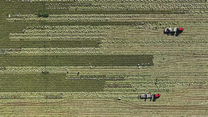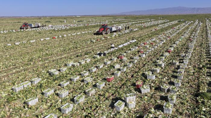 9月23日,菜农在甘肃山丹马场蔬菜基地里收获蔬菜(无人机照片)。新华社发(王超摄)