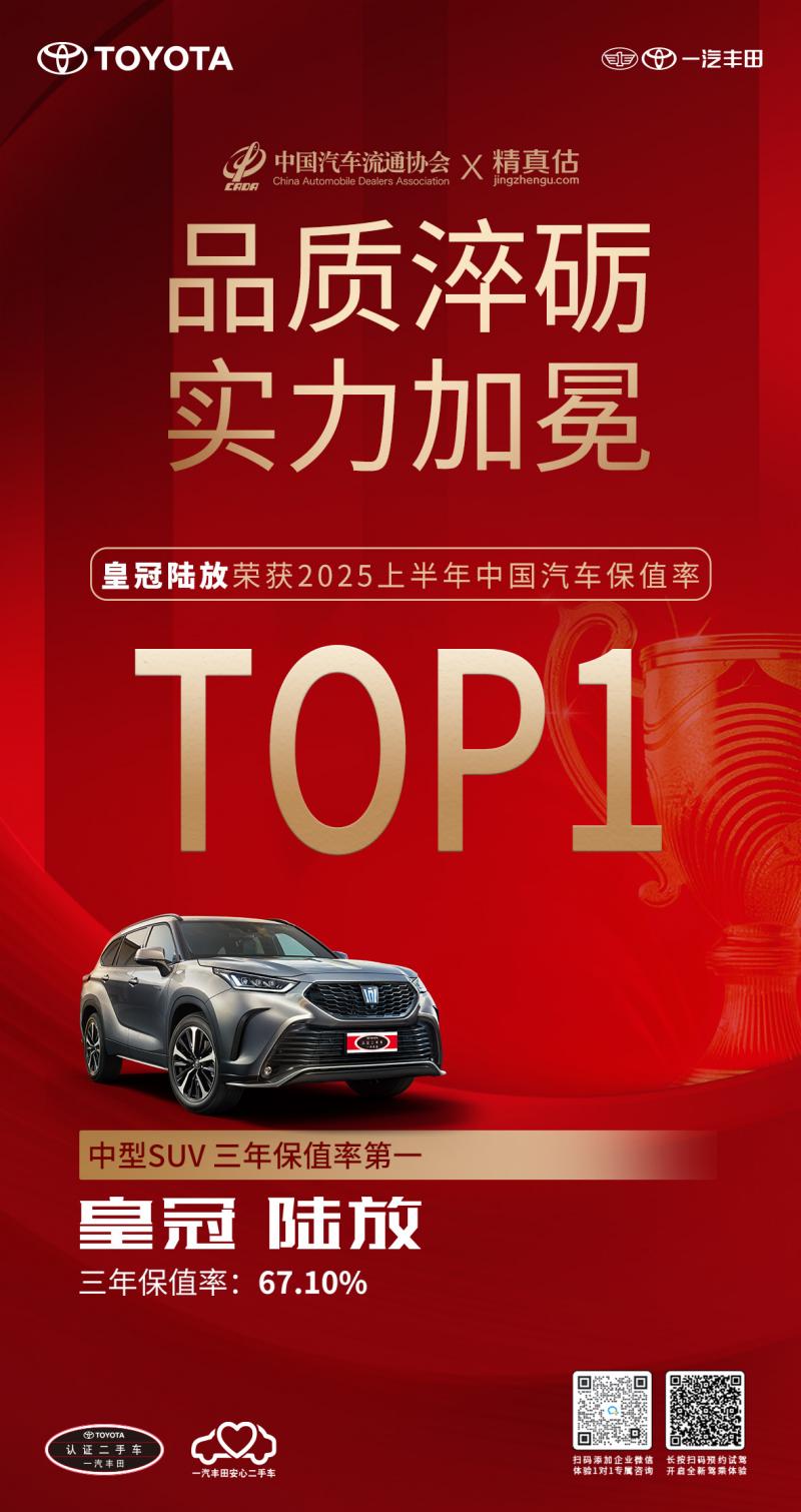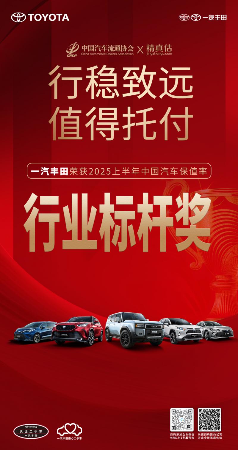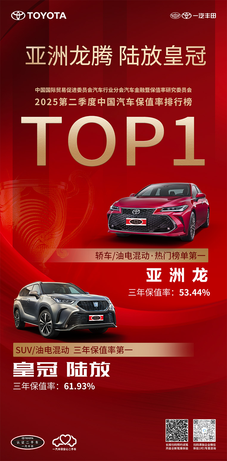 2025年9月,一汽丰田迎来品牌成立22周年,并将推出客户感恩季系列活动。作为系列活动之一,以"时光漫游派对"为主题的保值节活动,将于2025年9月27-28日在一汽丰田全国经销店隆重举行。用“保值节”来为活动命名,彰显了一汽丰田对产品保值率的自信,而这份自信来源于一汽丰田在最新行业评选中取得的一系列骄人成绩。2025年上半年,一汽丰田荣膺汽车保值率行业标杆奖;旗下皇冠陆放以67.1%的三年保值率荣登上半年中型SUV汽车保值率榜首;亚洲龙获得2025年第二季度轿车/油电混动热门榜单TOP1。这些亮眼成绩正是一汽丰田坚持长期主义、深耕品牌价值与服务所结出的硕果。