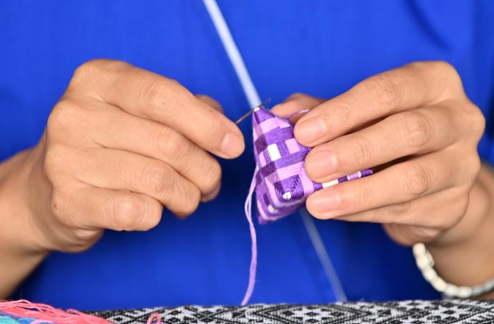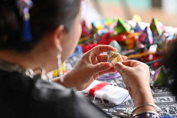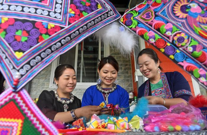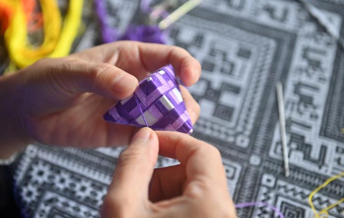 融侗族印染、刺绣、织锦等技艺于一体,最早用来悬挂在风雨桥、鼓楼等公共建筑中,是祈求风调雨顺的吉祥饰品,其制作技艺列入柳州市非物质文化遗产代表性项目名录。9月24日,在广西三江侗族自治县八江镇三团村,当地村民制作侗族吉祥花。