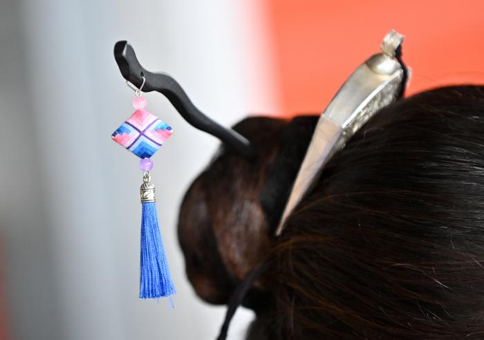 9月24日,在广西三江侗族自治县八江镇三团村,当地村民佩戴侗族吉祥花头饰。