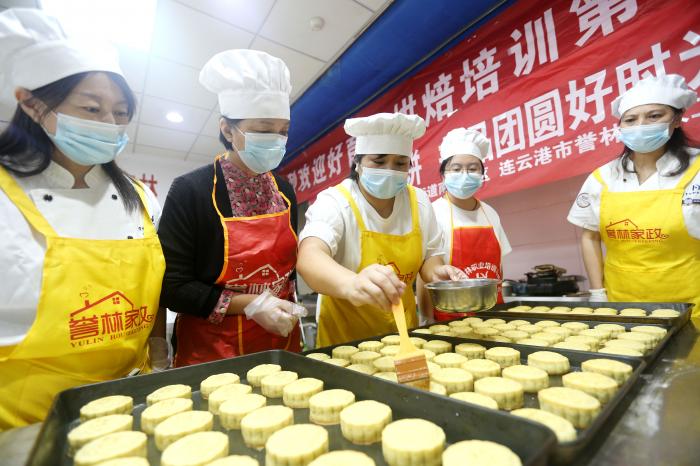 9月25日,在江苏省连云港市誉林家政培训机构,连云区墟沟街道南巷社区居民学习制作月饼。新华社发(王春 摄)
