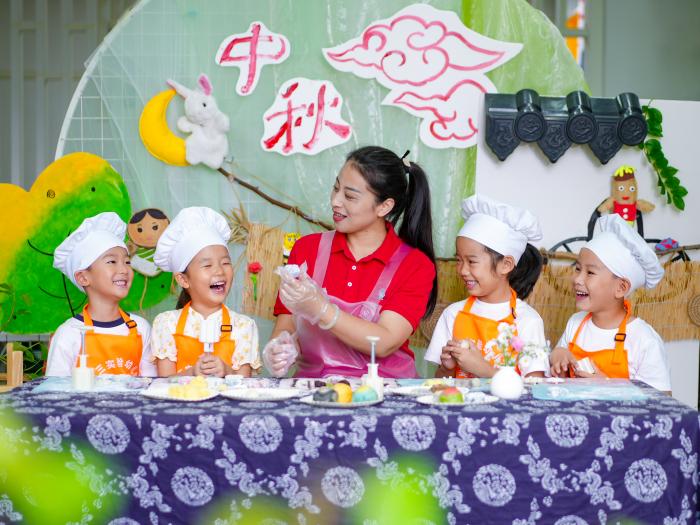 9月25日,在江苏省泰州市姜堰区第三实验幼儿园,小朋友们在老师的指导下学习做月饼。新华社发(周社根 摄)