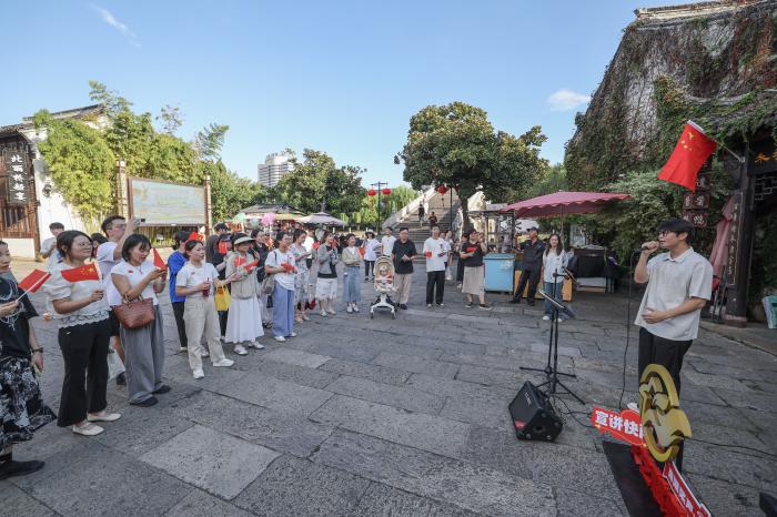 9月25日,在浙江省嘉兴市南湖区月河历史街区荷月桥广场上,新嘉街道的党员志愿者举行“文艺赋美”快闪表演,志愿者带领游客一起演唱《歌唱祖国》等爱国歌曲。新华社记者 徐昱 摄