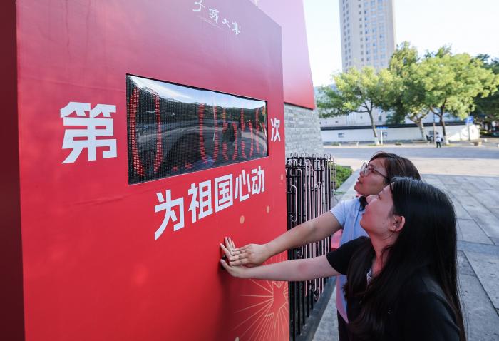 9月25日,在浙江省嘉兴市南湖区建设街道的子城城墙边,市民参加我为祖国心动打卡活动。新华社记者 徐昱 摄