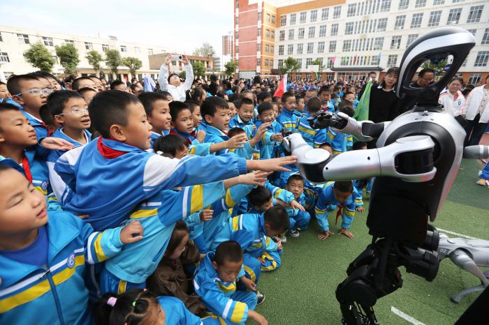 9月25日,在甘肃省定西市安定区西关小学,学生和人形机器人互动。新华社发(王克贤摄)