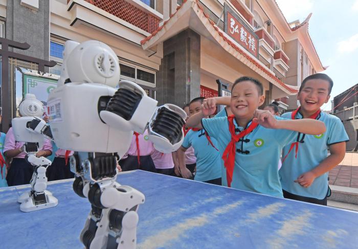 9月25日,在福建省泉州市泉港区后龙实验小学,学生和跳舞机器人互动。新华社发(林弘梫摄)