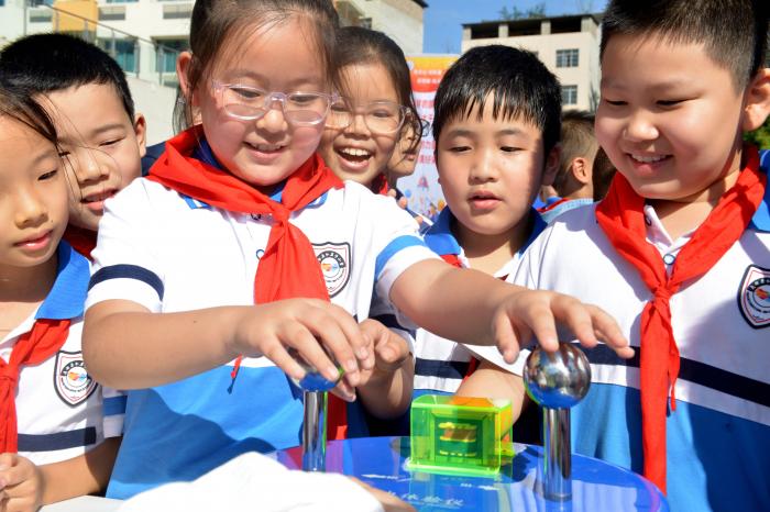 9月25日,四川省南充市南部县红岩子小学学生在体验趣味科普装置。新华社发(张枥摄)