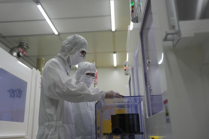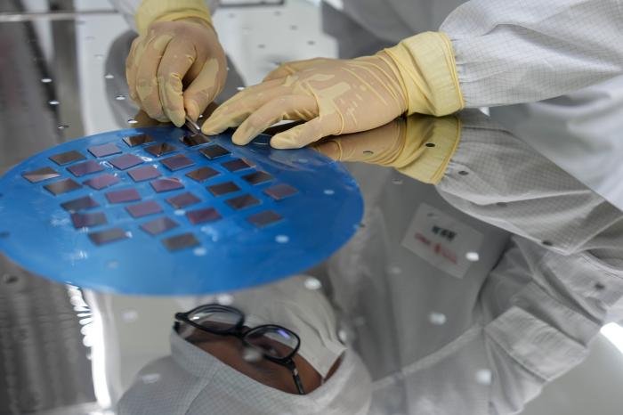 9月25日,工程师在上海交通大学无锡光子芯片研究院光子芯片中试线取片。