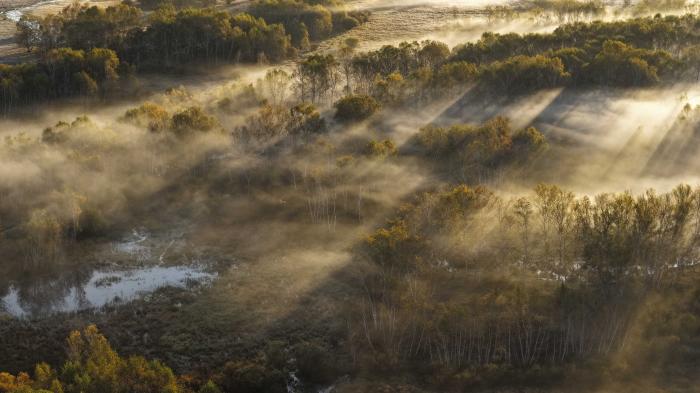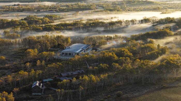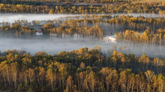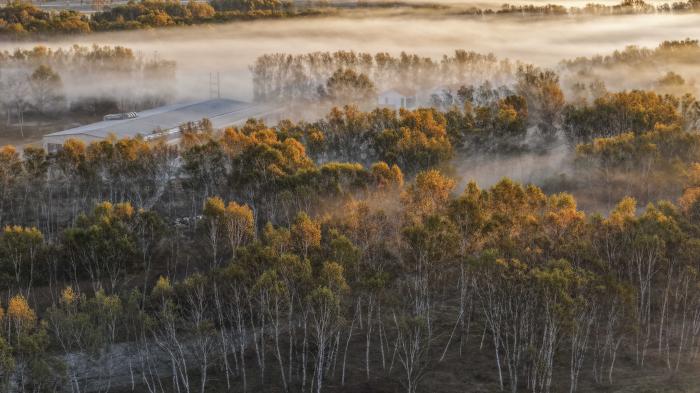 9月25日,在河北省承德市围场满族蒙古族自治县坝上草原拍摄的晨景(无人机照片)。