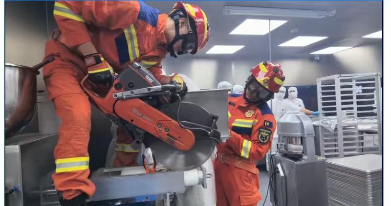 消防站到达现场后,发现该男子正站立在店铺内机器旁,左手被卷入进料口内。消防员了解现场情况后得知,因机器内部为金属结构,拆解困难。