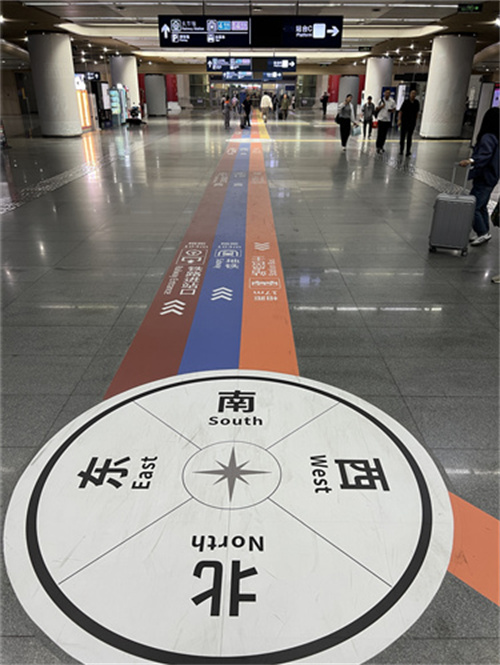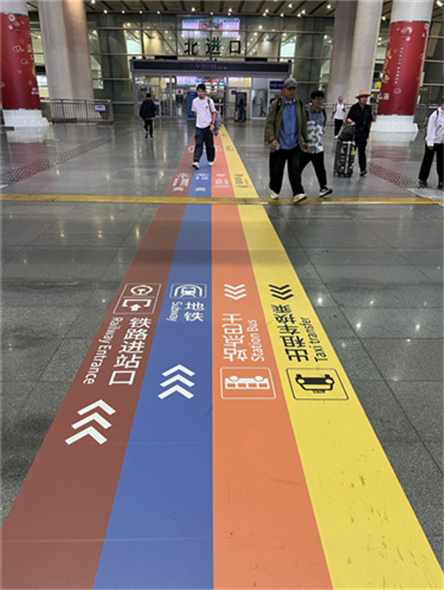 “我们希望通过更直观、更友好的方式,缓解旅客在换乘中的焦虑感。”北京市重点站区管委会南站办工作人员介绍,“彩虹地贴系统不仅是视觉上的创新,更是基于旅客真实流线的精细化设计。不同颜色对应不同交通工具,连续铺设形成‘引导流线’,在关键节点强化提示,从而减少徘徊和误判。”