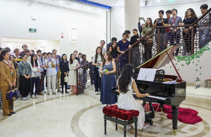 入驻仪式现场,燕京学堂国际生在钢琴伴奏下,演唱了中国经典民歌《茉莉花》。