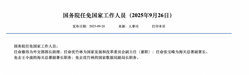 蔡伟任外交部部长助理,沈竹林任国家发改委副主任(兼职)