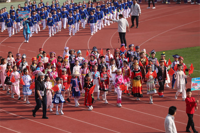 北京青年报记者在现场看到,开幕式表演环节,每个年级的同学组成一个方阵,依次走过主席台,响亮喊出自己的口号。其中,南校区二年级的方阵格外醒目,小学生们身穿各个民族的传统服饰,伴着歌声走入会场。