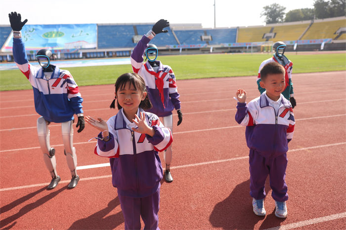随后,三名穿上小学、初中、高中校服的人形机器人,与一年级小同学展开50米短跑对决。成功“打败”人形机器人的一年级小学生夏雨初高兴地说:“我以前也参加过运动会,但是从来没跟机器人比过。比赛时心里一直想着要赢过机器人。”