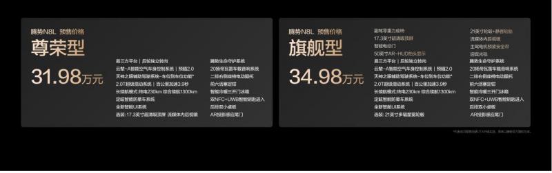 9月26日,腾势汽车全新大六座安全豪华SUV——腾势N8L正式开启预售,预售价31.98万至34.98万元。作为与科技安全旗舰SUV腾势N9一脉相承的家庭豪华伙伴,腾势N8L与腾势N9共同构成了腾势品牌独有的旗舰豪华双子星矩阵,分别瞄准不同细分市场。腾势N9定位科技安全旗舰SUV,科技力拉满、豪华感给足,更追求旗舰的科技性能。腾势N8L则是更聚焦家庭的安全豪华SUV,继承了N9的安全技术和灵活驾控,有大空间和豪华感,更追求家庭的豪华舒享。