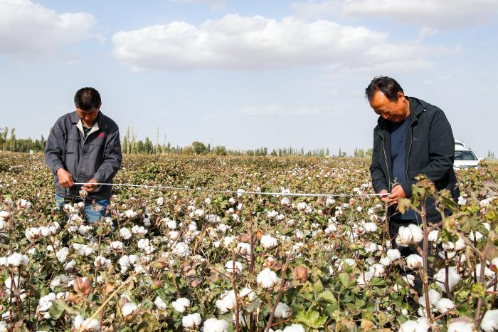 敦煌市地处西北内陆,属于极干旱荒漠气候区,土壤盐碱化问题突出。9月25日,在敦煌市转渠口镇阶州村盐碱地综合治理示范区的一片棉田,敦煌市农技中心高级农艺师贺生兵(左)和同事对棉花进行测产。