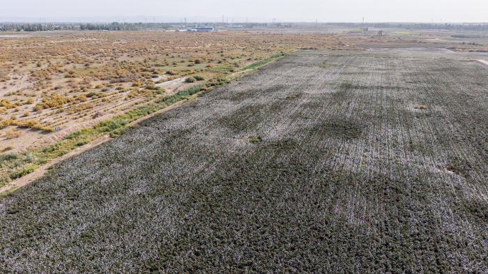 近年来,敦煌市通过系统化综合治理,有效减轻了土壤盐碱化危害。同时,当地因地制宜推广种植棉花等耐盐碱作物,积极发展特色产业,实现了农业增产与农民增收。这是9月25日在敦煌市转渠口镇阶州村拍摄的盐碱地综合治理示范区的棉田(无人机照片)。