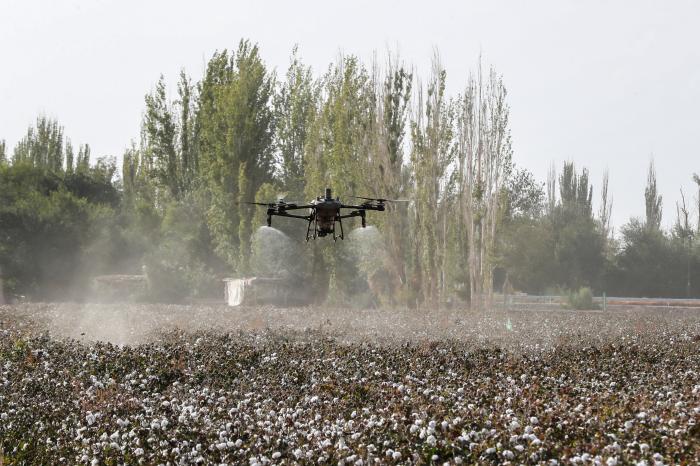 9月25日,在敦煌市转渠口镇阶州村盐碱地综合治理示范区的一片棉田里,农用植保无人机在进行喷施作业。
