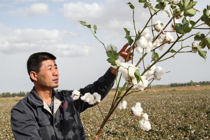 9月25日,在敦煌市转渠口镇阶州村盐碱地综合治理示范区的一片棉田里,敦煌市农技中心高级农艺师贺生兵选取一株样本观察棉株结铃情况。