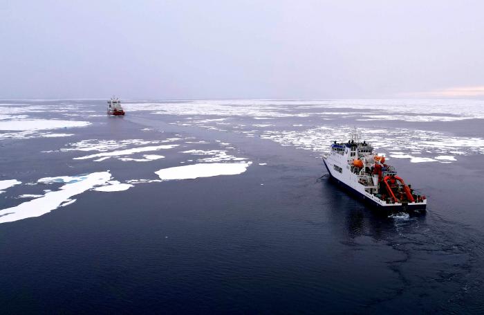 “雪龙2”号(左)在北极冰区为“深海一号”破冰引航(无人机照片,8月5日摄)。