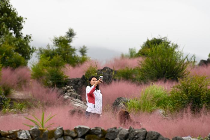 9月26日,游客在重庆市酉阳土家族苗族自治县叠石花谷景区游玩拍照。新华社发(邱洪斌摄)