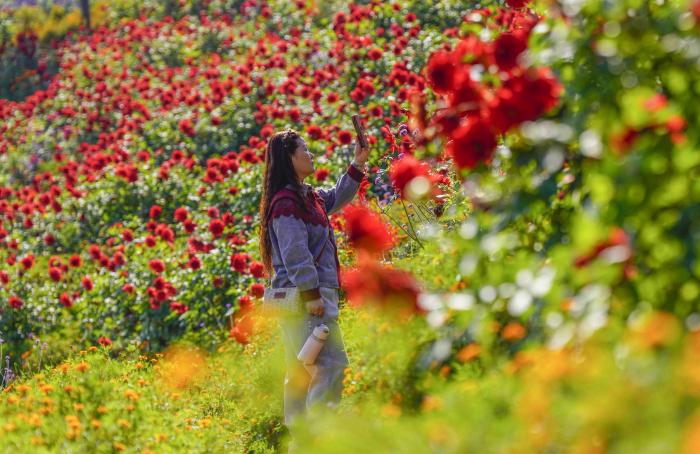 9月26日,游客在河北省承德市兴隆县南天门乡高山花海景区赏花拍照。新华社发(刘满仓摄)