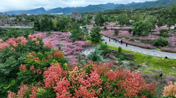 9月26日,游客在重庆市酉阳土家族苗族自治县叠石花谷景区游玩(无人机照片)。新华社发(邱洪斌摄)