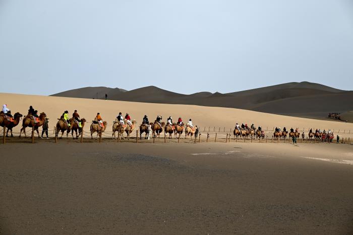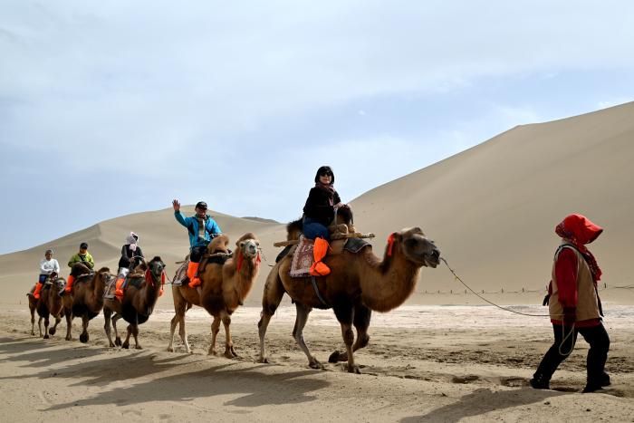 9月25日,游客在甘肃省敦煌市鸣沙山月牙泉景区游览。新华社发(张晓亮摄)