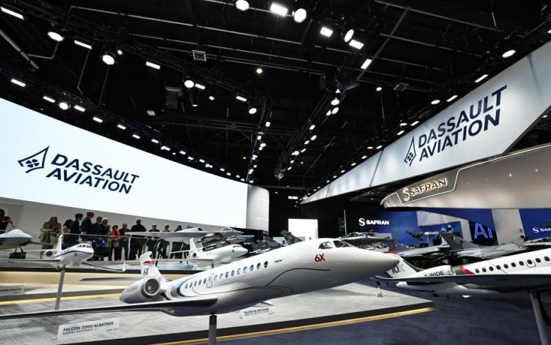 6月17日,在法国巴黎近郊布尔歇机场举行的第55届巴黎航展上,人们参观达索公司展区。新华社记者高静摄