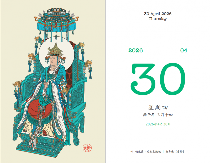 《朝元图》画师继承“吴带当风”的韵味,以元代雄浑圆润的笔调赋予人物翩然神采,高超的线描技法,画人物须眉毕现,画器具扣之有声,所用石青、石绿、朱砂、赤金等天然矿物颜料,历经700年依旧光彩夺目.《永乐宫日历2026》也力图展现壁画的精妙细节与灵动色彩。日历装帧为书本式对开,可摆放、翻阅,亦可单页收藏保存。