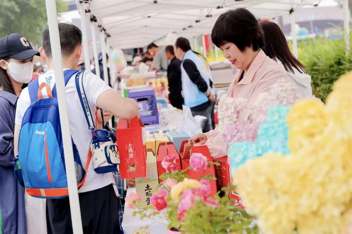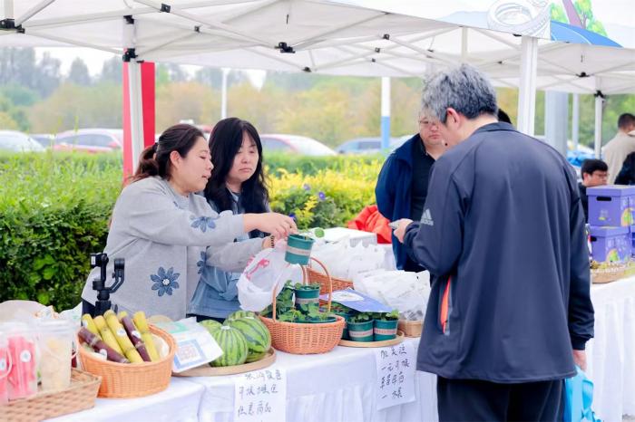 市集互动区,邮政部门带来了备受到场群众青睐的精品赛事主题文创产品;金融机构设置了服务点,为参赛选手和到场群众提供金融知识普及服务。当地农户更是带来了新鲜采摘的葡萄、蔬菜、玉米等特色农产品,引得完赛选手及到场群众品尝购买。