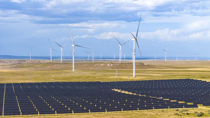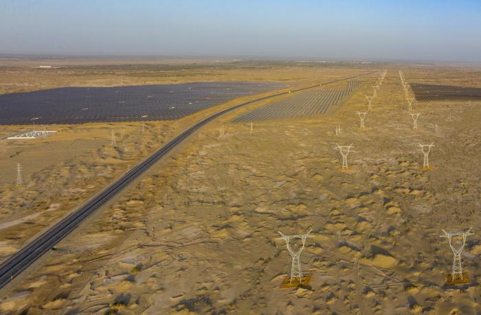 风能、太阳能资源丰富的新疆,是国家“十四五”规划纲要中明确的大型清洁能源基地。9月22日在新疆巴音郭楞蒙古自治州境内的乌若高速附近拍摄的光伏电站和输电线(无人机照片)。新华社记者 江文耀 摄