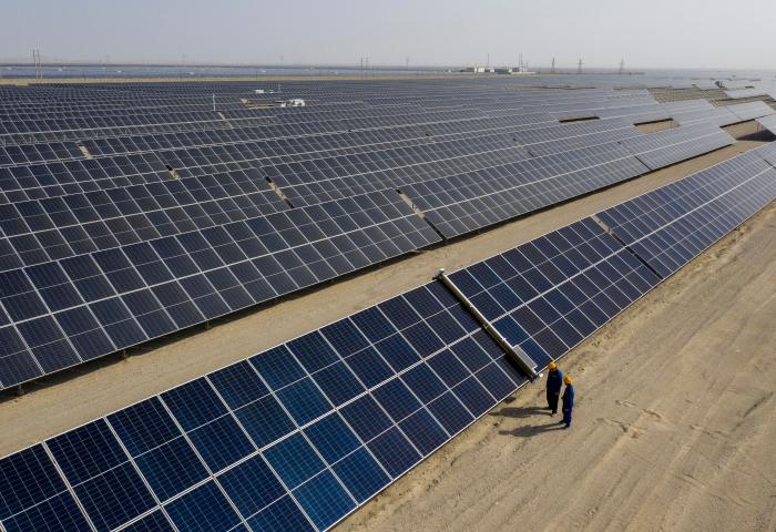 新疆依托十大风区、五大光区的先天优势,开启“追风逐日”的新型电力模式,努力打造国家能源资源战略保障基地,新能源发展步入快车道。9月22日,工作人员在位于新疆巴音郭楞蒙古自治州若羌县的中国绿发新疆中绿电若羌400万千瓦光伏项目内巡视(无人机照片)。新华社记者 陈朔 摄