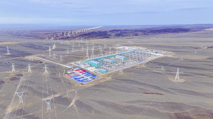 9月22日在新疆巴音郭楞蒙古自治州若羌县拍摄的三峡集团“疆电外送”第四通道电源项目施工现场(无人机照片)。新华社记者 陈朔 摄