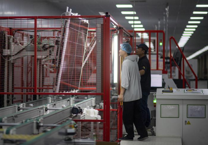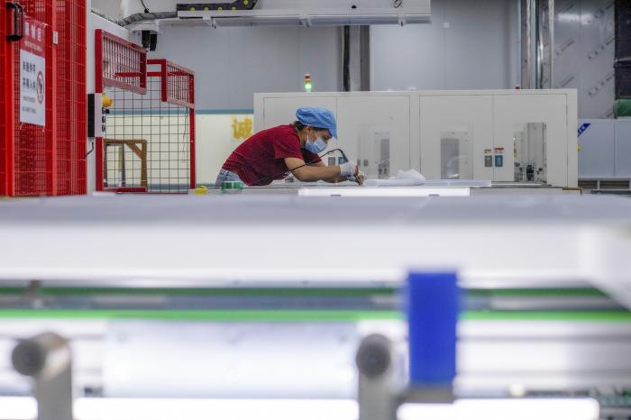 9月22日,工人在新疆巴音郭楞蒙古自治州若羌县的国晟企诚新能源有限公司对光伏电池片进行叠层返修。新华社记者 江文耀 摄