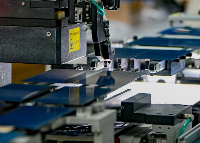 9月22日,在新疆巴音郭楞蒙古自治州若羌县的国晟企诚新能源有限公司,全自动划片机在切割光伏电池片。新华社记者 陈朔 摄