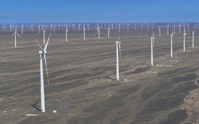 在新疆哈密地区巴里坤哈萨克自治县拍摄的三塘湖风电场(4月27日摄,无人机照片)。新华社发(张利民 摄)