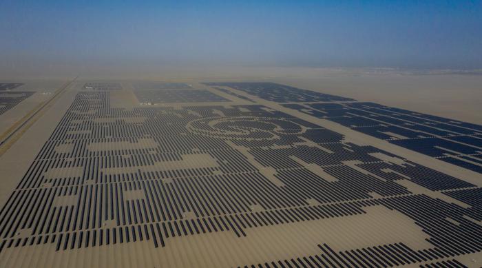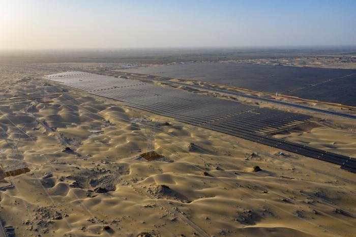 9月22日在新疆巴音郭楞蒙古自治州若羌县拍摄的中国绿发新疆中绿电若羌400万千瓦光伏项目(无人机照片)。该项目每年可发电69.08亿千瓦时,满足南疆200万户家庭用电需求。新华社记者 陈朔 摄