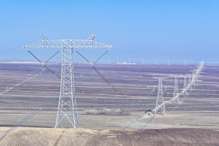 矗立在戈壁上的±800千伏哈密—重庆特高压直流输电线路工程(4月8日摄,无人机照片)。新华社发(张灵军 摄)