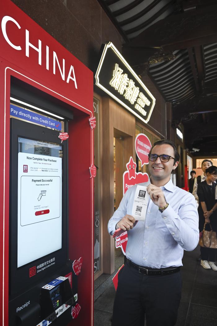 “Meet China”入境旅游数字消费大屏具备商品导购、故事化解说、多语种交互与境外银行卡便捷支付等功能,可帮助外籍游客实现从“感兴趣”到“完成购买”的全过程自助服务。9月27日,外籍嘉宾展示“Meet China”入境旅游数字消费大屏打印的购物核销单。
