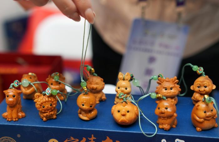9月27日在文采会现场拍摄的融合了“奉城木雕”非遗技艺的Q版十二生肖饰品。