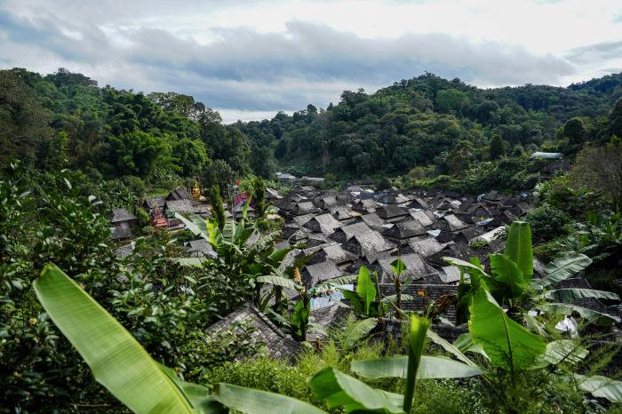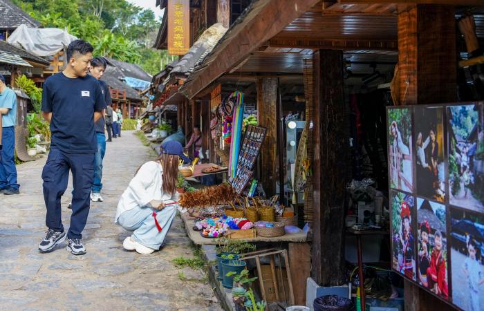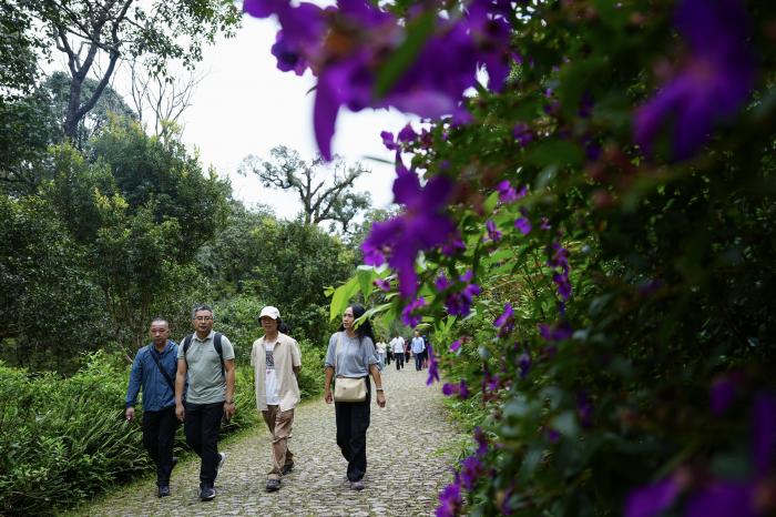 秋日天高气爽,百年古茶树郁郁葱葱,游客漫步在古寨之中,体验民俗,感受千年茶文化的活态传承。这是9月27日拍摄的景迈山糯岗古寨。