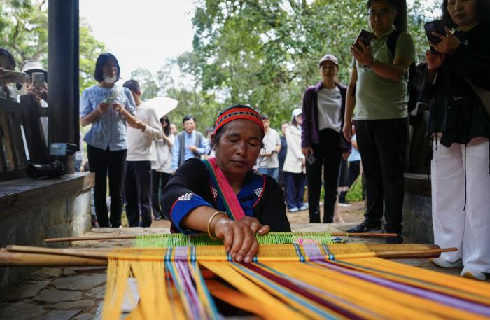 9月27日,一名当地村民在景迈山大平掌古茶园为游客展示织锦技艺。