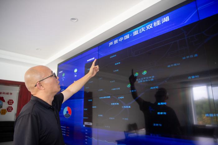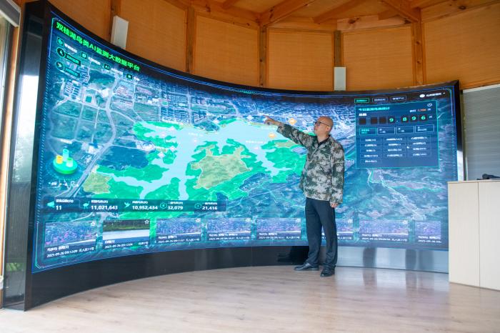 9月26日,重庆市梁平区湿地保护中心工作人员余先怀在双桂湖国家湿地公园内介绍鸟类AI监测大数据平台。新华社记者 唐奕 摄