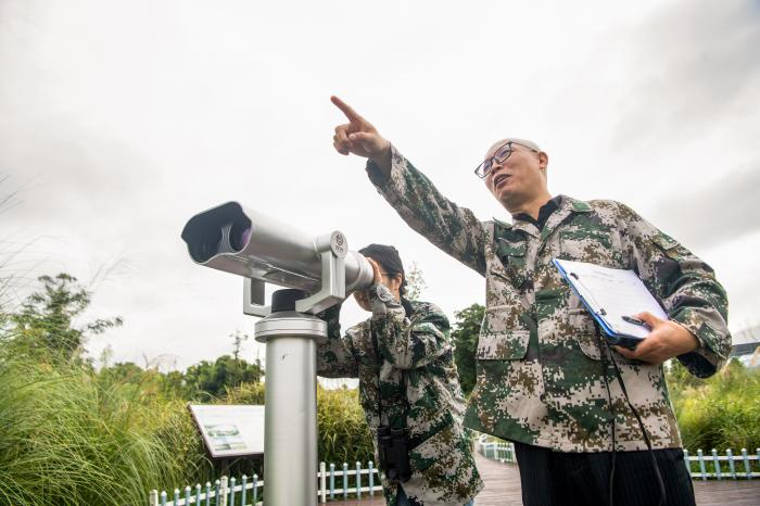 重庆市梁平区湿地保护中心还计划将“声景中国”项目的声纹识别技术与AI鸟类监测系统深度融合,为湿地生物多样性保护提供更为充足的数据支撑。9月26日,重庆市梁平区湿地保护中心工作人员余先怀(右)、吕妮洪在双桂湖国家湿地公园内使用望远镜观测鸟群。新华社记者 唐奕 摄