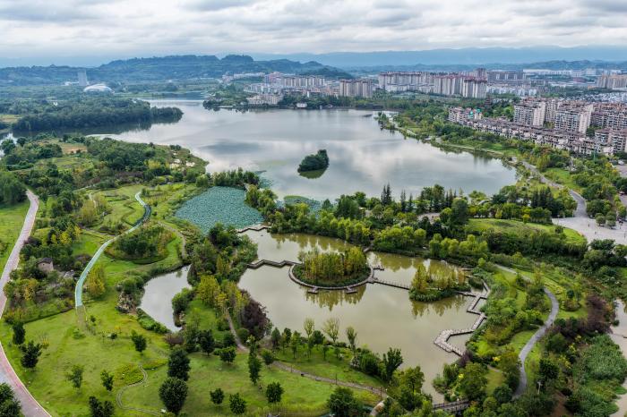 该项目通过布设声纹传感器,采集鸟鸣、虫鸣、蛙鸣等自然声,构建开放共享的声景数据库,为生态保护提供科学支持。重庆双桂湖国家湿地公园一角(9月26日摄,无人机照片)。新华社记者 唐奕 摄